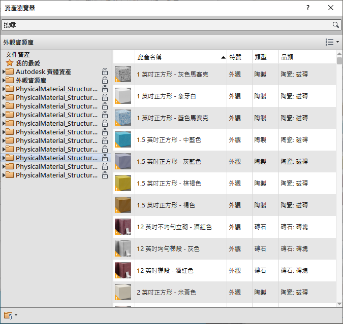 資產儲存在 Revit 專案或資源庫中。位於 Revit 專案中但未被任何材料參考的資產則會儲存至「無法參考的資產」資源庫。您可以根據需要在 Revit 工作階段期間建立和編輯未參考的資產。但是您必須儲存 Revit 專案,才能儲存在工作階段期間建立或編輯的任何未參考資產。
