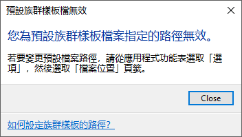 注意: 移除基本內容套件,可能會導致 Revit 因為在 Revit.ini 指定的族群樣板路徑中找不到族群樣板而顯示下列訊息。