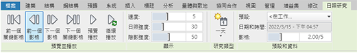 - 研究類型:變更日照研究的類型。在「靜態影像」、「一天」、「多天」和「照明」之間進行選擇。