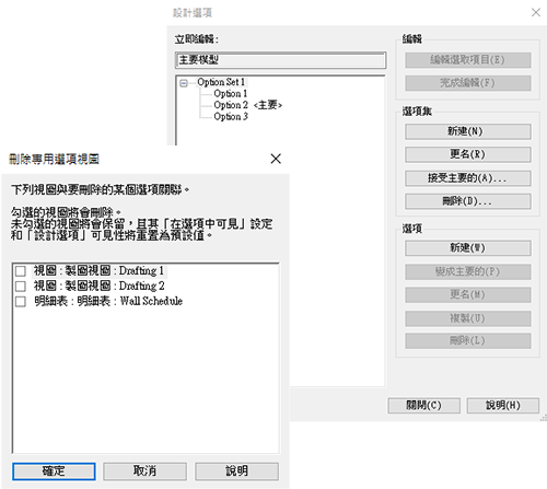 在「刪除專用選項視圖」對話方塊中預設不勾選視圖,您只能勾選要刪除的視圖。先前,以即將刪除的設計選項建立的某些視圖類型 (例如製圖視圖或明細表) 會被勾選為刪除,而且無法取消勾選。
