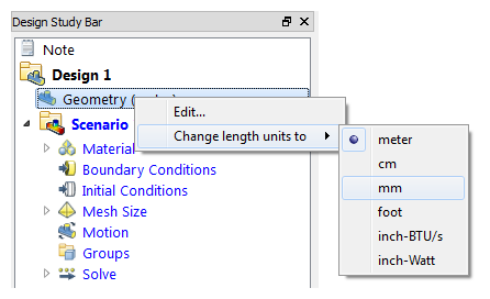 If launching from the other CAD tools or from the Desktop, change the length units to mm by right clicking on the Geometry branch of the Design Study Bar: