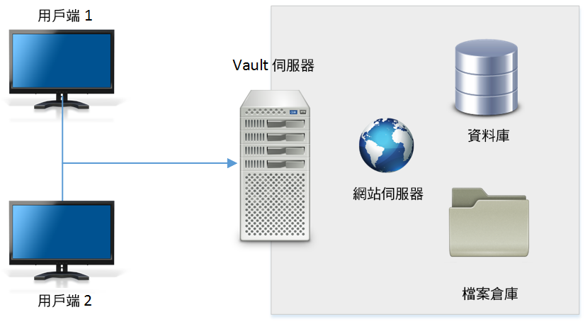 單一 Vault 環境中包含一個 Vault 伺服器和一個或多個 Vault 用戶端。有一個 Vault 複雜型用戶端、一個 Vault 精簡型用戶端和一些 Vault 增益集與其他應用程式整合在一起。使用者還可以選擇安裝 Vault Office 複雜型用戶端。