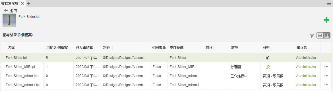 顯示包含詳細資料的搜尋結果,例如材料、檔案路徑或使用來源檔案的檔案數量。會先列示來源檔案,以便您可以輕鬆比較來源檔案相關資料和找到的重複項目。相同的性質以綠色指示。