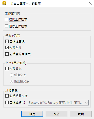 抑制「退回出庫使用」對話方塊後,您可以指定對應的 Vault 作業如何影響相關檔案。