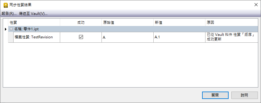 Inventor 性質 (自訂性質) 將永遠與 Part1 料件 (從「主要」模型狀態指定) 同步,因此,TestRevision 將在同步後修訂為版序 A.1。但是,檔案版序將保持為版序 A。