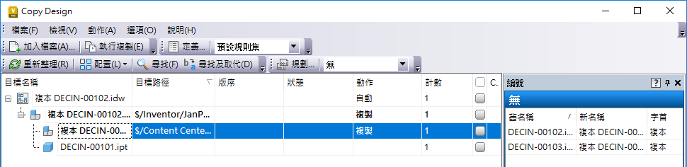 例如,如果將檔案標記為要進行複製,並將關聯的圖面標記為「自動」,則在複製作業完成後,圖面將會與關聯檔案接收相同的新檔名 (帶有 (1)、(2)、(3) 等字尾) 和儲存位置。