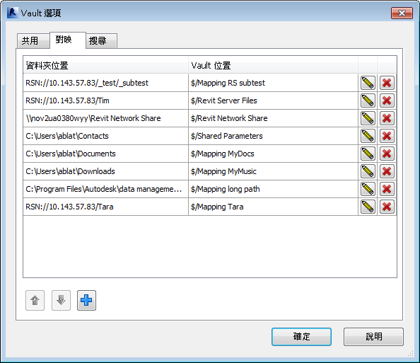 在「Vault 選項」對話方塊的「對映」頁籤上,將任何本端、網路或 Revit 伺服器資料夾對映至任何 Vault 資料夾。