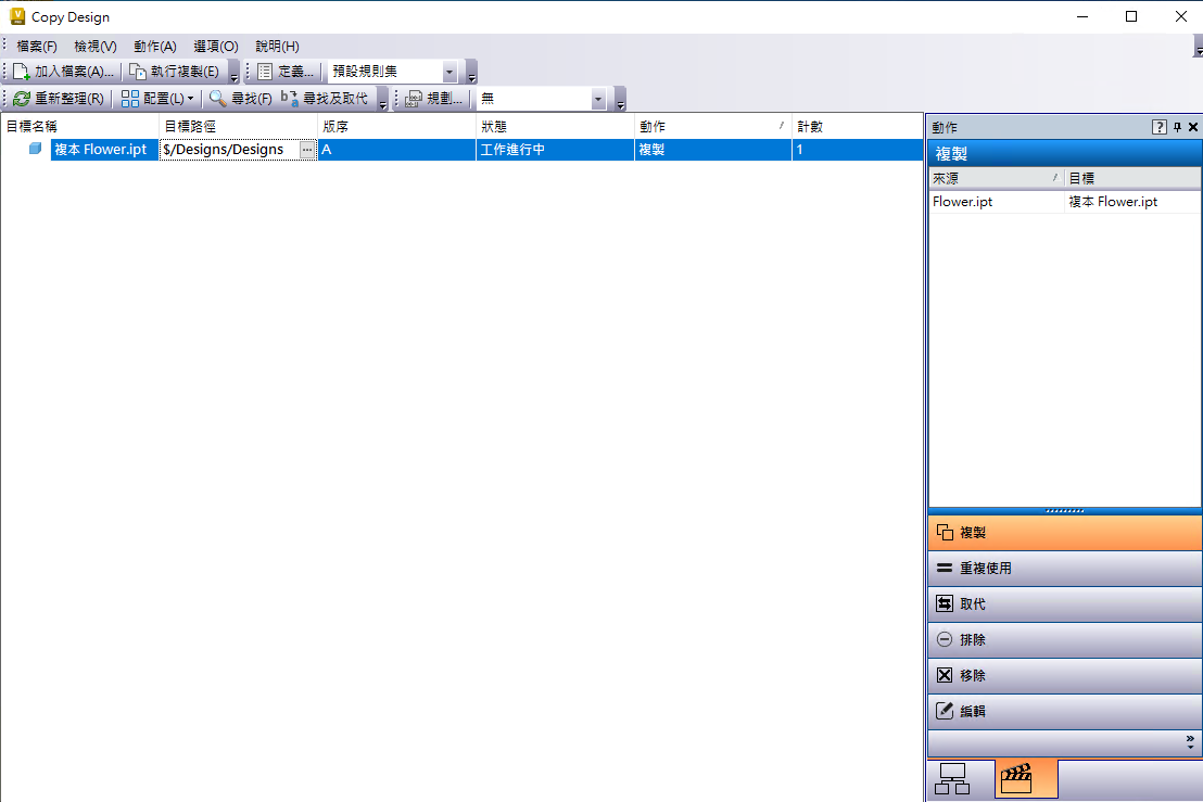 「Copy Design」功能會建立與來源檔結構相同的設計複本。在「Copy Design」對話方塊中,您可以選擇要複製、重複使用、重複使用分支、取代、排除或分離的既有設計中的部分。