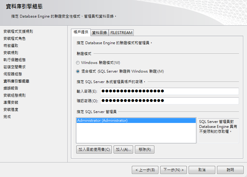 - 加入本端管理員帳戶 (或所需帳戶) 做為 SQL Server 管理員。登入 SQL Server 時,僅在此對話方塊中輸入的 Windows 使用者具有完整的權限。所有其他 Windows 登入帳戶均將被視為訪客帳戶。