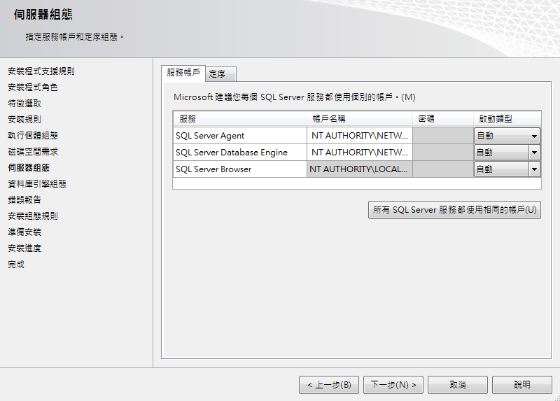 - 為 SQL Server Database Engine 指定 NT AUTHORITY\NETWORK SERVICE 帳戶。也可以使用本端系統帳戶。如果您計劃執行備份並還原至遠端位置,請指定網域使用者帳戶。將「啟動類型」設定為「自動」。