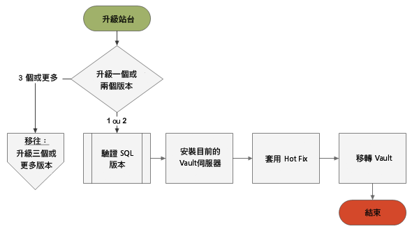 確認既有版本的 SQL 與要安裝的下一版 Vault 是否相容。如果既有 SQL 版本需要升級 (請參閱本文前一章〈升級 SQL〉),請執行任何必要的升級,然後再返回此節。