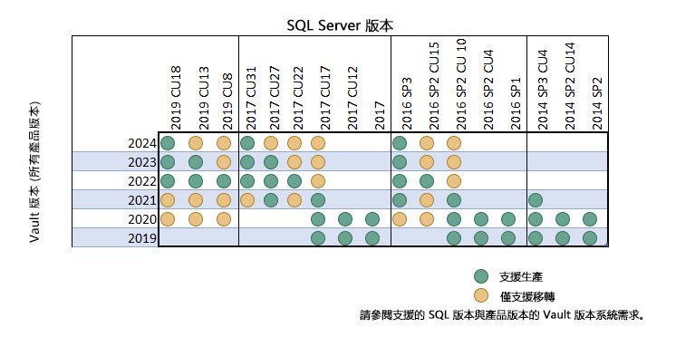 以下圖表總結了 Vault 和 SQL 的相容版本 (以綠色圓點表示)。黃色圓點表示建議的升級路徑。請參閱您的 Vault 版本對應的 Vault 系統需求,以確保 Vault 和 SQL 產品版本之間的相容性。