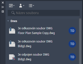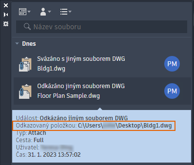 Do událostí Přehledu aktivit jsou zahrnuty také v případě, že byl výkres připojen jako externí reference k jinému výkresu. Název výkresu, který odkazuje na aktuální výkres, se zobrazí v podrobnostech o události.
