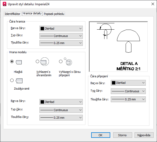 Nastavuje vlastnosti hraniční linie detailu, hrany modelu a čáry připojení v detailech.