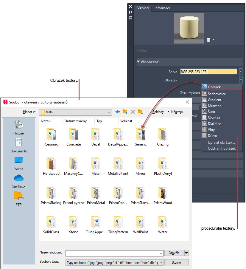 Produkt poskytuje knihovnu obrázků, které lze použít spolu s texturami. Můžete také přidat vlastní textury pomocí následujících typů souborů:
