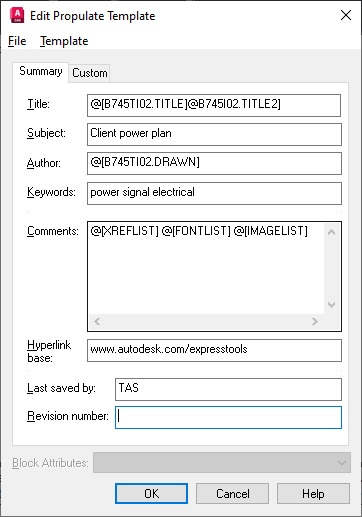 Pomocí předdefinované šablony lze příkazem PROPULATE vyplnit data vlastností výkresu ve složkách výkresů. Informace, které lze použít, zahrnují literální řetězce, hodnoty atributů extrahované ze zadaných bloků s atributy a seznamy připojených externích referencí, obrázků a písem. Příklad: Máte celou projektovou složku výkresů, které používají stejné rohové razítko s atributy. Pomocí příkazu PROPULATE a upravené šablony můžete extrahovat hodnoty atributů z každého rohového razítka v každém výkresu a přidat je do dialogu Vlastnosti výkresu aktuálního výkresu. Použitím příkazu PROPULATE lze také vložit seznam externích referencí, obrázků a písem použitých v každém výkresu do pole Komentáře.