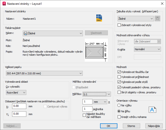 Zadaná nastavení stránky budou uložena s rozvržením a mohou být použita na ostatní rozvržení nebo importována do jiných výkresů.