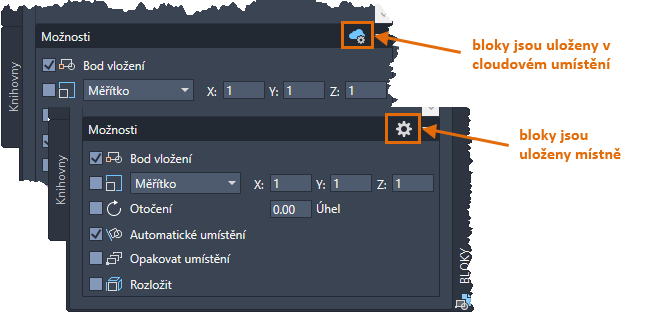 Tip: Můžete vytvořit „výkresy knihovny bloků“, ve které jsou uloženy všechny související definice bloků. Pokud použijete tuto metodu, vyberte na paletě při vkládání výkresu knihovny bloků možnost Rozložit, abyste zabránili zobrazení výkresu jako takového, případně jeho vypsání v oblasti náhledu.