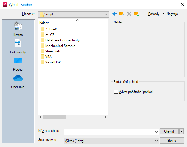 Zobrazuje náhled vybraného souboru. Chcete-li uložit obrázek (bitmapu) se souborem výkresu, použijte možnost Uložit obrázek náhledu na kartě Otevřít a Uložit v dialogu Možnosti.