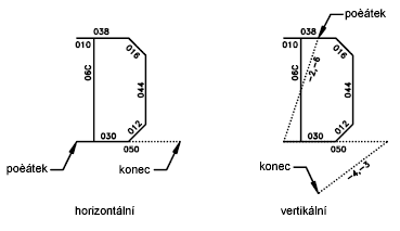 Pokud je potřeba tento speciální kód použít v definici znaku, další kód se provede nebo vynechá v závislosti na orientaci. Jestliže je směr vertikální, je zpracován další kód; je-li horizontální, další kód je přeskočen. V horizontálním textu je za počáteční bod každého znaku považován levý koncový bod účaří, ve vertikálním pak nejvyšší středový bod znaku. Ve vertikálním textu je počáteční bod horní střed znaku. Na konci každého znaku je obvykle kreslen segment s vypnutým perem až do umístění počátečního bodu dalšího znaku. U horizontálního textu je to doprava; u vertikálního textu dolů. Speciální kód 00E (14) se používá primárně pro úpravu rozdílů v počátečních a koncových bodech, umožňuje použít stejné definice tvaru znaku horizontálně i vertikálně. Například tato definice písmene D může být použita v definici textu pro horizontální i vertikální text. *68,22,ucd 2,14,8,(-2, 6),1,030,012,044,016,038,2,010,1,06C,2,050, 14,8,(-4,-3),0 ![]() |