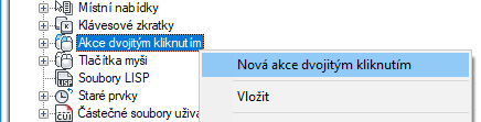 - Na kartě Vlastní v podokně Uživatelské úpravy: <název souboru> klikněte na znaménko plus (+) vedle uzlu Akce dvojitého kliknutí. Tím se tento uzel rozbalí.