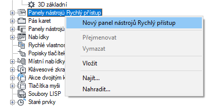 1. Na kartě Vlastní v podokně Uživatelské úpravy: <název souboru> klikněte pravým tlačítkem myši na uzel Panely nástrojů Rychlý přístup. Klikněte na položku Nový panel nástrojů Rychlý přístup.