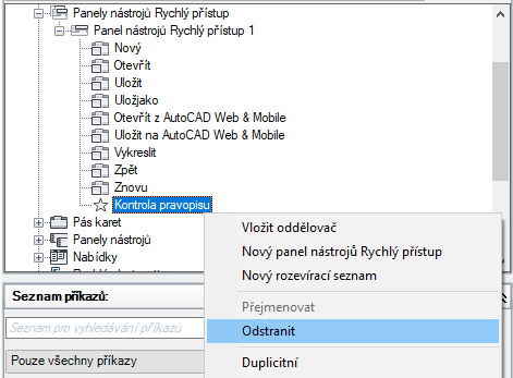 Odebrání příkazu nebo ovládacího prvku (editor CUI)