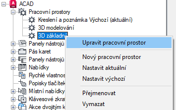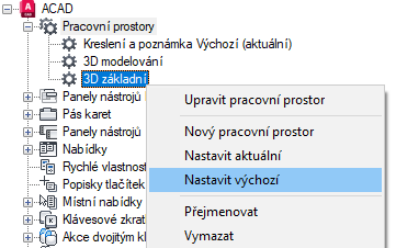 Pracovní prostory v souboru CUIx lze označit jako výchozí. Nastavení pracovního prostoru jako výchozího určuje, který pracovní prostor v souboru CUIx má být obnoven, pokud je soubor CUIx načten do aplikace poprvé nebo pomocí příkazu NAČTICUI.
