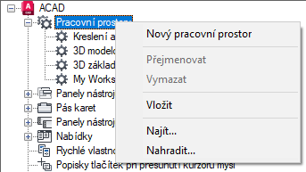2. Na kartě Vlastní v podokně Uživatelské úpravy: <název souboru> klikněte na znaménko plus (+) vedle uzlu Pracovní prostory. Tento uzel se rozbalí.