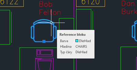Předpokládejme, že jste chtěli přesunout tyto židle z hladiny ŽIDLE na hladinu FURNITURE pomocí možnosti Změnit na aktuální hladinu.