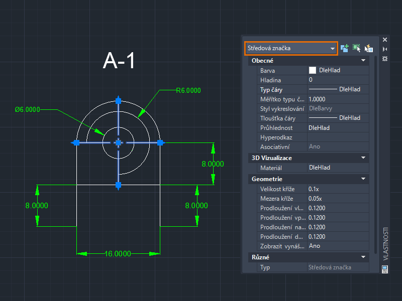 Kromě zobrazení aktuálních nastavení výkresu je paleta Vlastnosti také účinným nástrojem k úpravám vlastností objektu. V tomto cvičení provedeme změny vlastností jednoduché mechanické součásti.