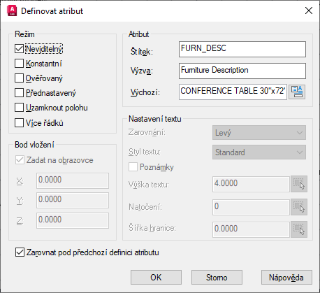 - Spuštěním příkazu ATRDEF znovu vytvořte druhou definici atributu a určete hodnoty podle následujícího obrázku: