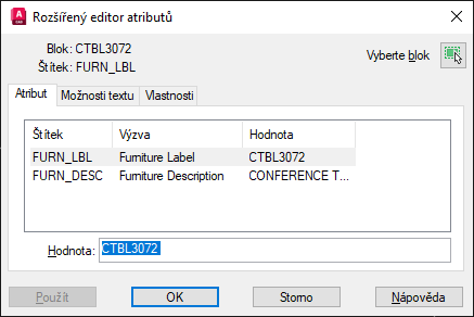 - Štítek – viditelný zástupný text, který se zobrazuje v okně výkresu před atributem přidávaným do bloku. Zadaná hodnota se používá k identifikaci atributu při extrahování hodnot z bloku.