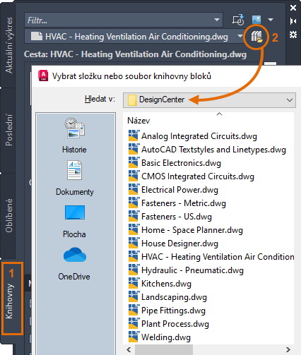 - Pokud chcete vybrat jiný výkres knihovny ze složky DesignCenter, ujistěte se, že karta Knihovny je aktuální (1) a klikněte na tlačítko pro navigaci mezi soubory (2).