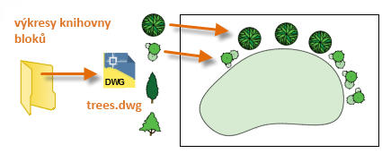 - Jedna nebo více definic bloků obsažených v souboru výkresu. Můžete například vytvořit výkres, který obsahuje pouze definice bloků stromů. Poté můžete vložit libovolné z těchto bloků z daného výkresu do aktuálního výkresu. Soubor výkresu, který obsahuje rodinu souvisejících bloků, se běžně nazývá výkresem knihovny bloků.