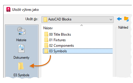 Tip: Když uložíte výkresy pro pozdější vložení, přejděte do složky, klikněte pravým tlačítkem a vytvořte několik dalších složek k uspořádání výkresů. Jeden nebo více bloků můžete přetáhnout na panel Místa, aby je bylo možné v budoucnosti snadno najít.