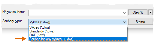 Jestliže pracujete samostatně, můžete vytvářet soubory šablon výkresu, které budou vyhovovat vašim aktuálním pracovním potřebám, a postupně k nim přidávat nastavení pro další funkce, jak se s nimi budete seznamovat. Chcete-li upravit existující soubor šablony výkresu, klikněte na tlačítko Otevřít, v dialogu Vybrat soubor vyberte položku Šablona výkresu (*.dwt) a vyberte soubor šablony výkresu.