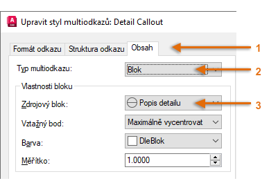 Chcete-li například vytvořit styl „odkaz na detail“, spusťte příkaz MODKAZSTYL. V dialogu Správce stylů multiodkazů klikněte na tlačítko Nový a zvolte popisný název nového stylu multiodkazu. Klikněte na kartu Obsah, vyberte položku Blok a potom položku Popis detailu, jak je znázorněno.