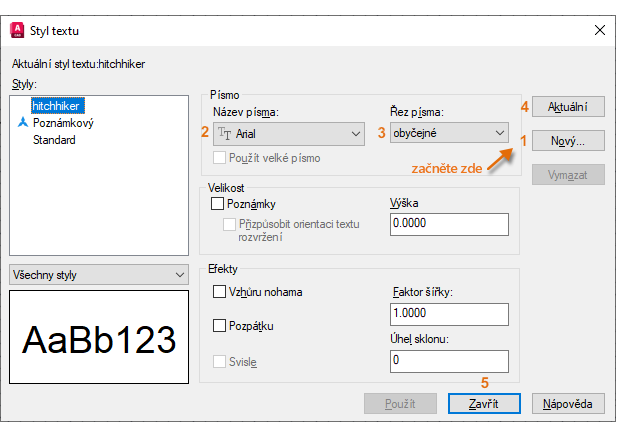 Při vytváření nového stylu textu zadejte jeho název a potom vyberte písmo a styl písma. Pořadí, v jakém klikáte na tlačítka, je uvedeno níže:
