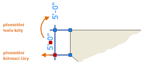 V tomto příkladu vyberete kótu, aby se zobrazily její uzly. Dále klikněte na uzel na textu kóty a přetáhněte ho do nového umístění nebo klikněte na jeden z uzlů na konci kótovací čáry a přetáhněte kótovací čáru.
