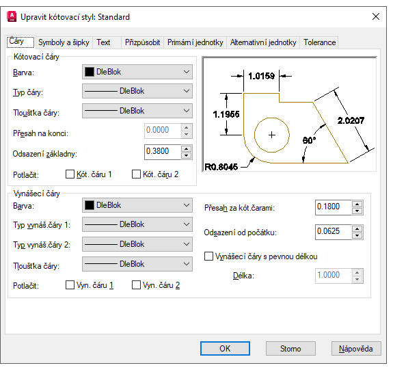 Výchozí styl kóty se nazývá Standardní (britské jednotky) nebo ISO-25 (metrické jednotky). Je přiřazen ke všem kótám, dokud jako aktuální styl kóty nenastavíte jiný styl.