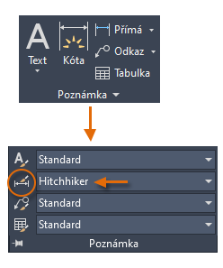 Název aktuálního stylu kóty, v tomto případě Stopař, se zobrazí v rozevíracím seznamu panelu Poznámka.