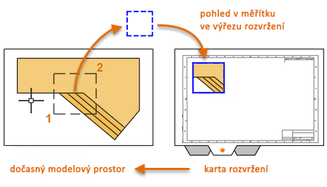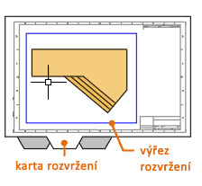 Výřez rozvržení je objekt, který je vytvořen na kartě rozvržení a zobrazuje pohled modelového prostoru s nastaveným měřítkem. Můžete si ho představit jako monitor kamerového systému CCTV, který zobrazuje část modelového prostoru. Výřez rozvržení lze vybrat jako kterýkoliv jiný objekt. Při výběru tohoto objektu se zobrazí několik uzlů, které umožňují změnit velikost výřezu, přesunout výřez a určit měřítko pohledu, které je ve výřezu obsaženo.