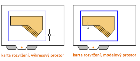 Při práci na kartě rozvržení lze přepínat mezi výkresovým a modelovým prostorem bez nutnosti návratu na kartu Model. Tento postup je vysvětlen dále. Jak je znázorněno na obrázku, přesuňte kurzor do výřezu rozvržení a dvojitým kliknutím přejděte do modelového prostoru. Do výkresového prostoru se vrátíte tak, že kurzor přesunete mimo výřez rozvržení a dvakrát kliknete. V modelovém prostoru jsou hranice výřezu rozvržení silnější.