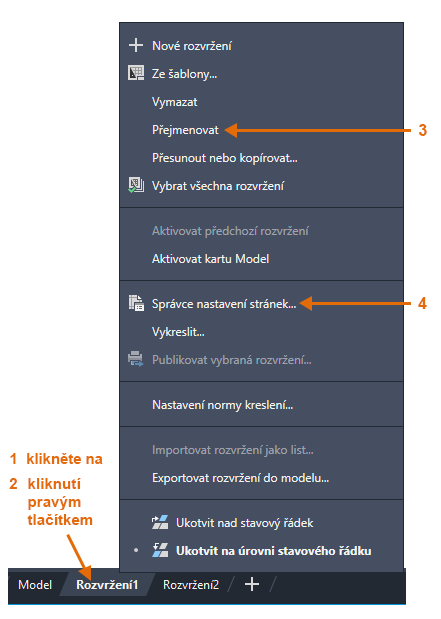 Jakmile přejdete na kartu rozvržení (1), měli byste na ni ze všeho nejdříve kliknout pravým tlačítkem (2) a přejmenovat ji (3) na něco konkrétnějšího než Rozvržení 1. Vhodným názvem může být odkaz na konkrétní velikost podle ANSI nebo ISO.