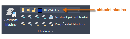 Jak je vidět na obrázku, hladina 10 STĚNY je aktuální hladina. Všechny nové objekty budou automaticky umístěny do této hladiny. V seznamu hladin zelené zaškrtnutí vedle hladiny 10 STĚNY potvrzuje, že se jedná o aktuální hladinu.