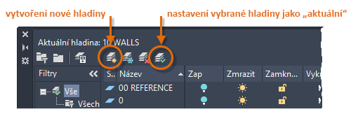 Chcete-li vytvořit novou hladinu, klikněte na zobrazené tlačítko a zadejte název nové hladiny. Pokud chcete nastavit jako aktuální jinou hladinu, klikněte na ni a potom klikněte na označené tlačítko.