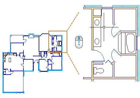 Tato část popisuje přesouvání a přibližování pohledu v různých pohledech ve výkresu. Zobrazte a upravte výkresy ze vzdálených umístění.