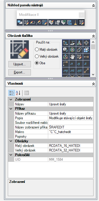 Podokno Seznam příkazů obsahuje všechny příkazy, které jsou k dispozici v aktuálně načtených souborech CUIx. V seznamu můžete vybrat existující příkaz a upravit jeho vlastnosti nebo vytvořit nový příkaz. Jestliže vytvoříte nový příkaz, bude přidán do souboru CUIx, který je zobrazen v rozevíracím seznamu v horní části podokna Uživatelské úpravy: <název souboru>.