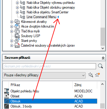 6. V podokně Seznam příkazů přetáhněte příkaz, který chcete přidat do místní nabídky, do podokna Uživatelské úpravy: <název souboru>.